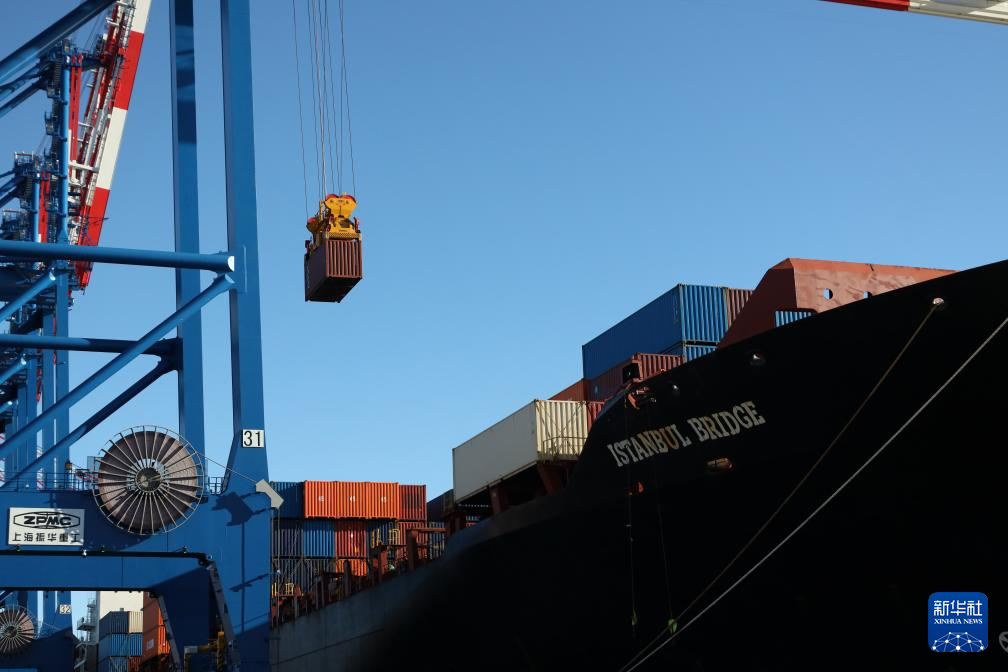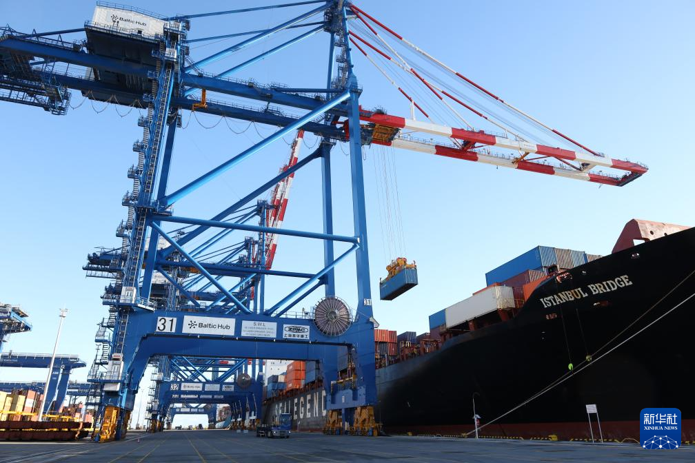 10月19日,在波兰北部格但斯克港,从中国宁波舟山港出发的中欧北极快航航线首艘货船进行装卸工作。新华社记者 崔力 摄