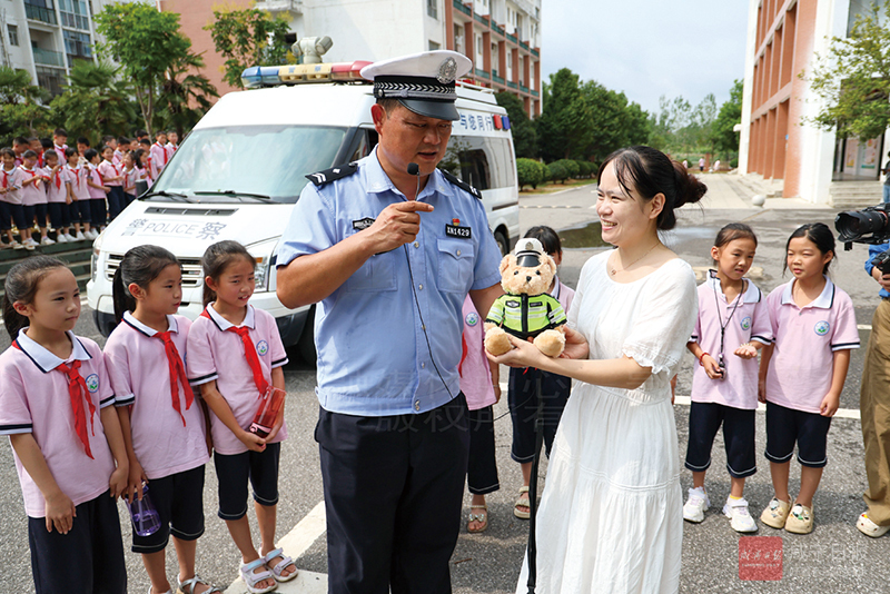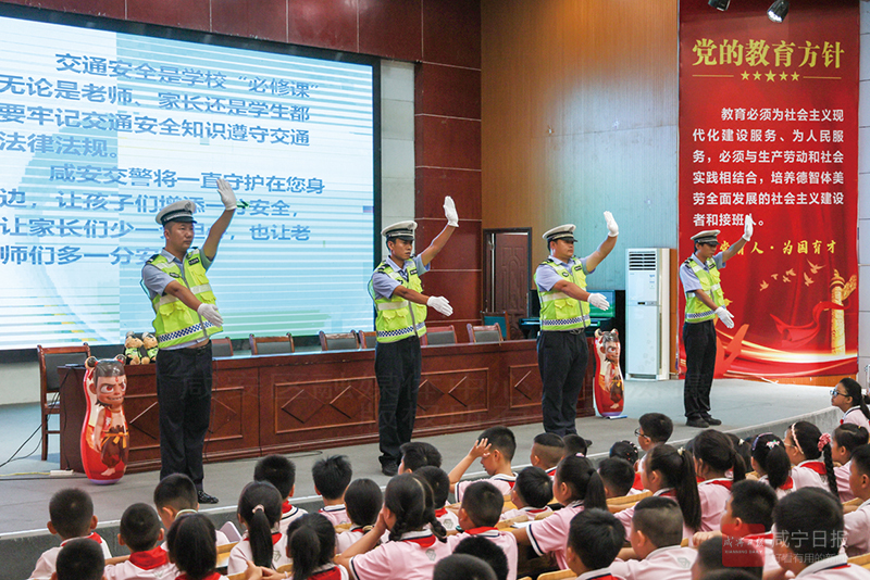上午9时许,在咸安区浮山中小学,咸安交警大队为学生们带来了一场别开生面的“开学第一课”:孩子们观看道路交通事故警示片,参与交通安全知识互动,表现突出的学生获得了可爱的“交警熊”奖品。活动中,交警们表演了整齐的手势操,并通过道路交通事故实景演示,让学生们直观了解交通安全的重要性。