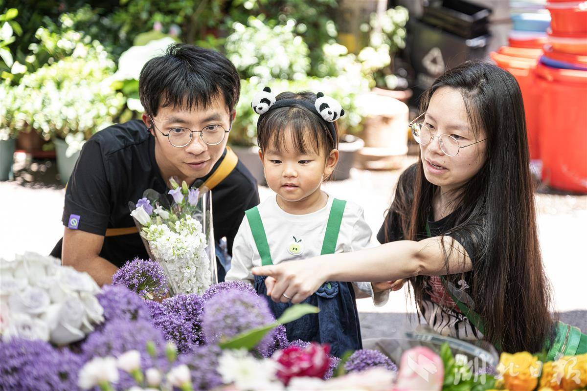 5月11日,在武汉循礼门花市,市民胡先生一家三口选购鲜花。(湖北日报全媒记者 任勇 摄)