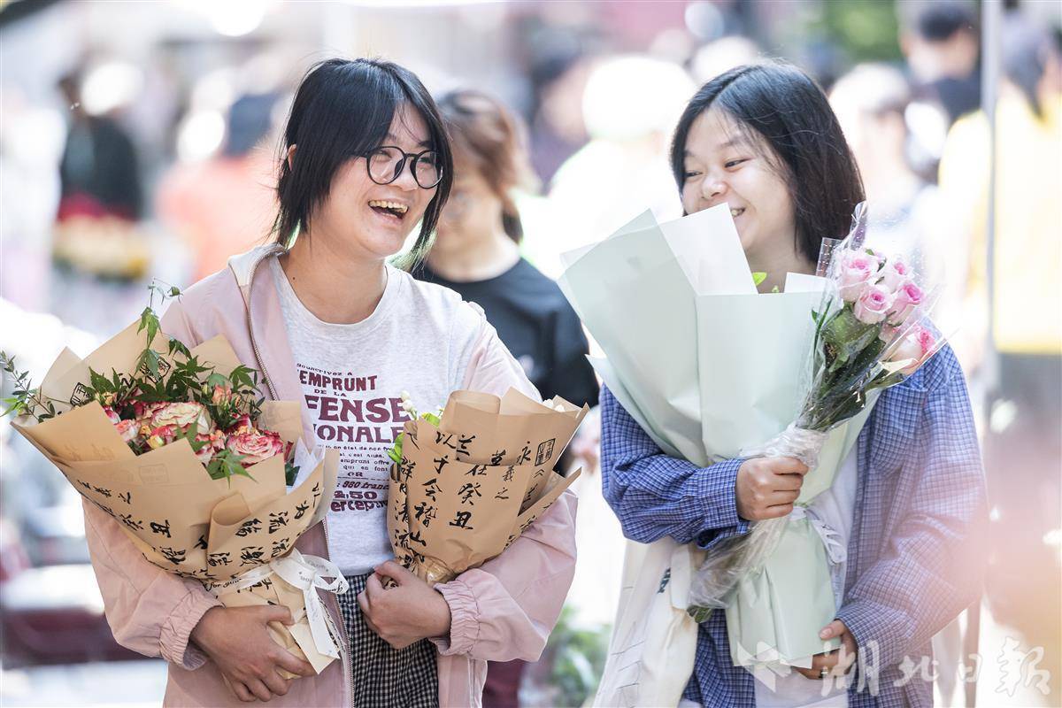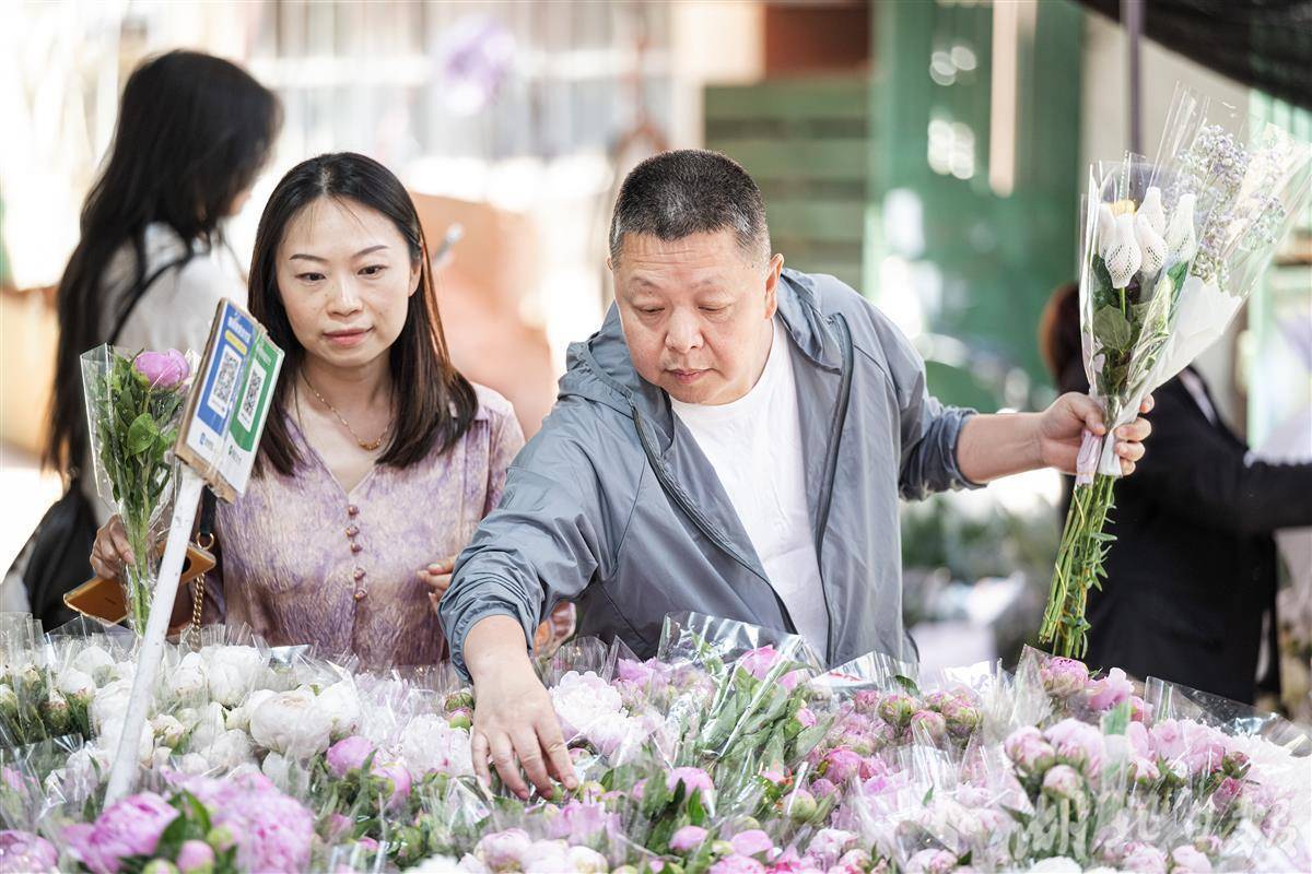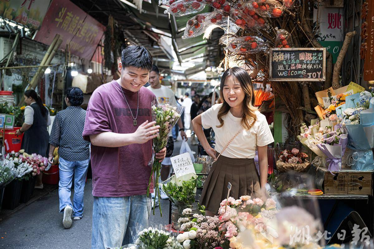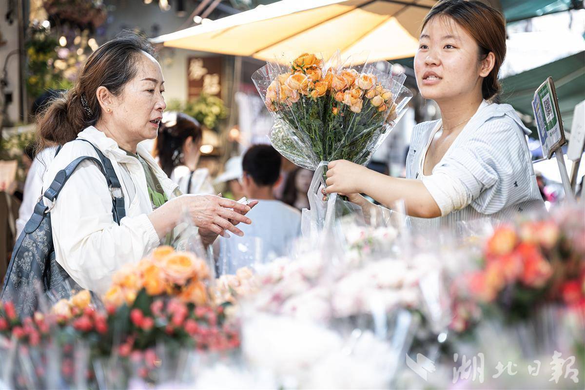 5月11日,在武汉循礼门花市,许多市民为母亲选购鲜花,带动消费市场“鲜花经济”持续升温。(湖北日报全媒记者 任勇 摄)