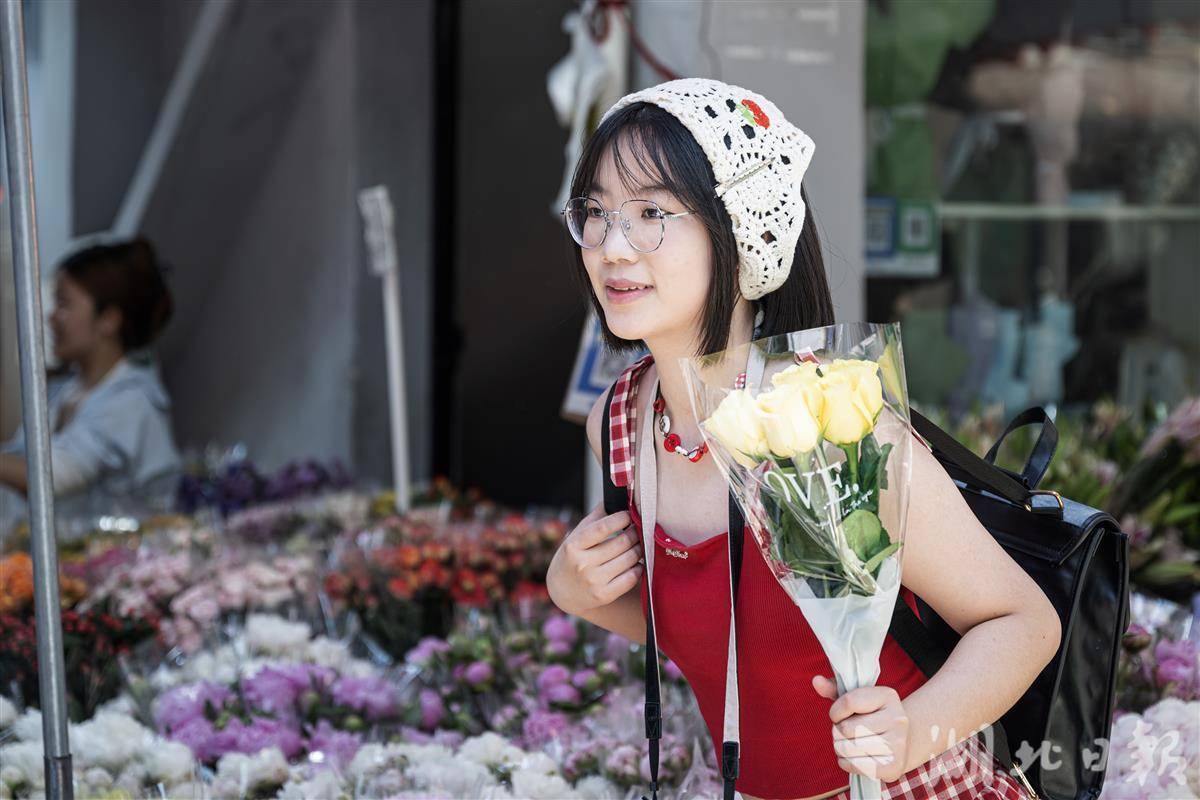 5月11日,在武汉循礼门花市,一名年轻女子与鲜花合影。(湖北日报全媒记者 任勇 摄)