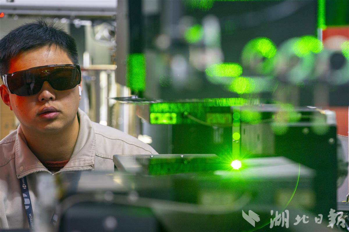 位于武汉新城光谷片区的华工科技精密激光高端装备制造车间,技术人员在测试载板成品缺陷激光标识设备。(湖北日报全媒记者 魏铼 摄)