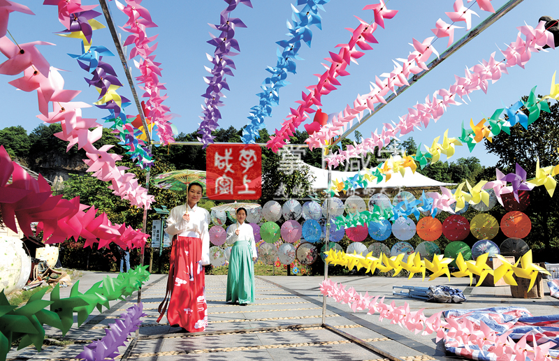 4月29日,太乙温泉度假村,油纸伞风车文化展启幕。色彩斑斓的油纸伞和小风车将景区装扮一新,慕名而来的游人纷纷拍照留影。