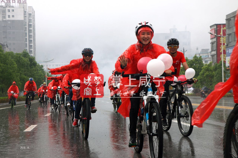 5月1日上午,通城一对新人在66名骑友组成的自行车婚礼车队的陪伴下,骑行在通城县城街头。