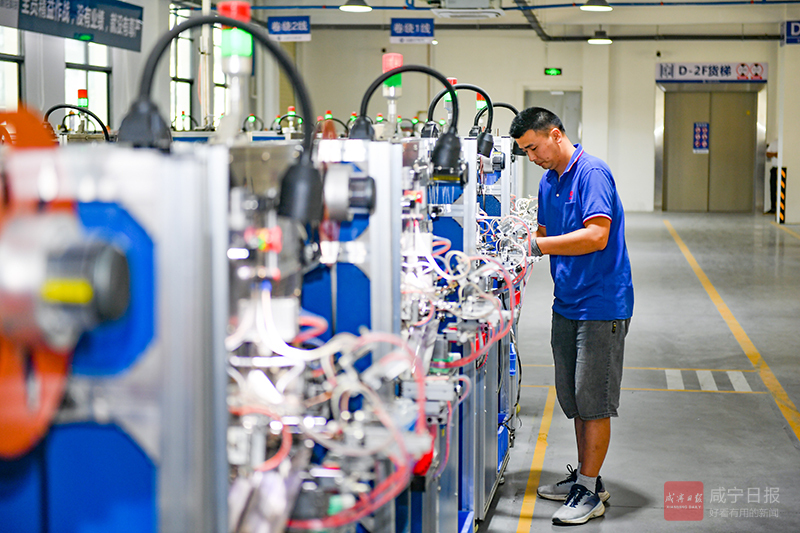 9月2日,在湖北玛耐伦科技有限公司二期车间,工作人员在新设备上加工抗磁电子产品。
