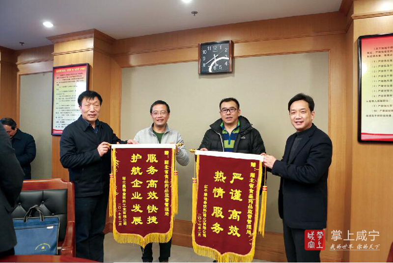 在会谈前,湖北奥瑞金饮料工业有限公司总经理陈中革、红牛维他命饮料(湖北)有限公司总经理葛海一,给省食品药品监督管理局送去“服务高效快捷,护航企业发展”、“严谨高效,热情服务”锦旗,并向他们高效率、勇担当、转作风服务企业表示致谢。